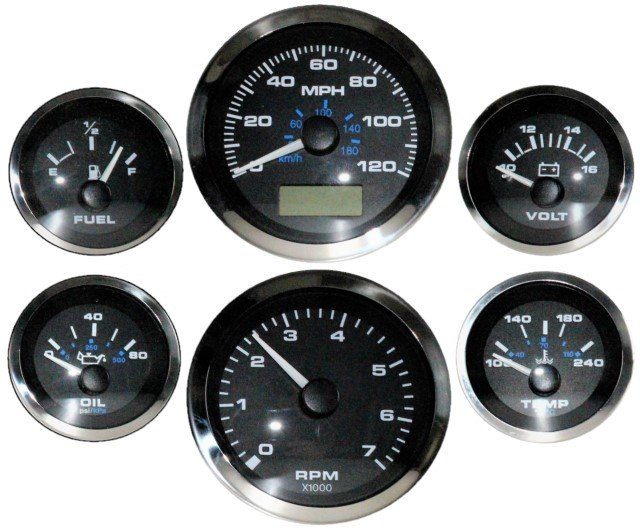 Elite Series six-gauge bundle includes an electric speedometer, tachometer, fuel level gauge, electric oil pressure gauge (with sender), electric water temp gauge (with sender), voltmeter gauge, GPS speedometer sending unit, gauge wiring harness and an LED kit for turn signal and high beam indicators.